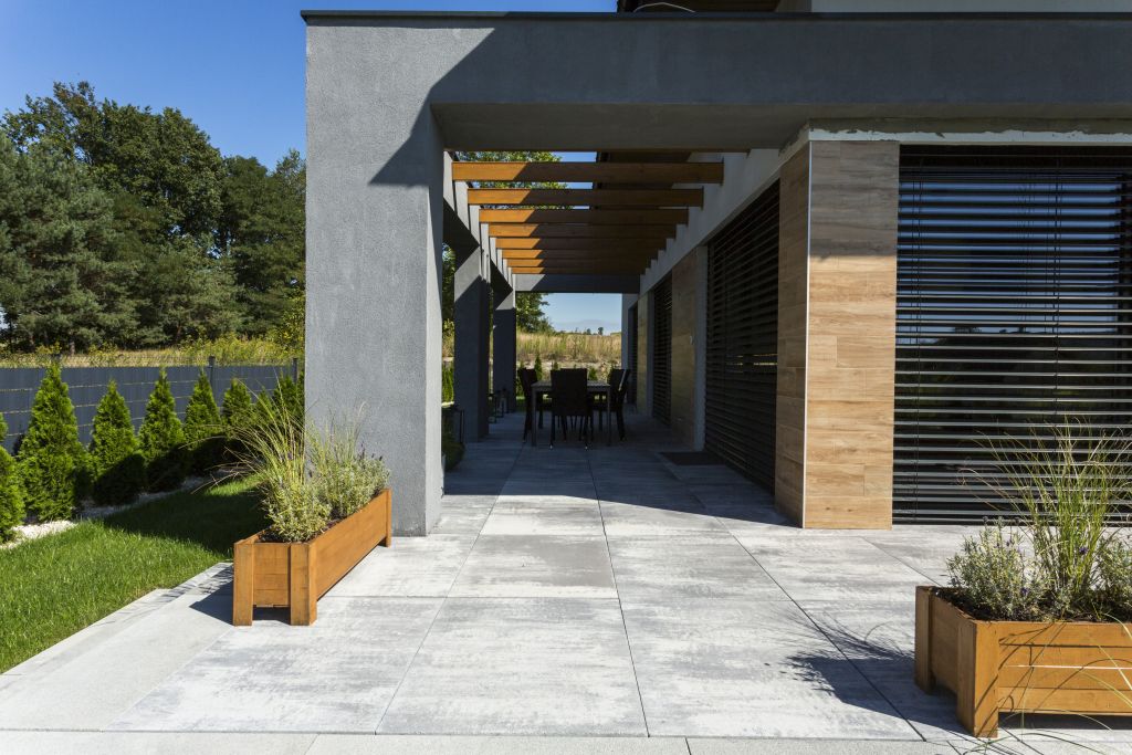 Niesztampowy design w połączeniu z szarością nie jest jedynym pomysłem na modny taras przy domu. Niezwykle popularne są również wielkie formaty, czyli płyty takie jak Polbruk Magna lub Lamell. Posiadają one geometryczny, prostokątny kształt oraz minimalistyczny charakter, który doskonale komponuje się z nowoczesnymi, a także bardziej klasycznymi aranżacjami. Magna to jedna z większych płyt betonowych dostępnych na rynku. Posiada wymiary: 100×75 cm i 50×75 cm. Wśród dostępnych kolorów znajduje się melanżowa szarość nerino. Alternatywą może być płyta Polbruk Lamell. Ma nieco mniejszy format: 60×40 cm i jest dostępna w gładkiej fakturze w dwóch odcieniach szarości – nerino i stalowym, natomiast w płukanej – w melanżowym kolorze ritmo_d. Porównując oba wielkoformatowe rozwiązania, należy zaznaczyć, że płyta Lamell, ze względu na grubość 4,5 cm, jest dedykowana nawierzchniom tarasowym, natomiast płyty Magna można zastosować również na podjazdach czy placach. Wynika to z dostępnych grubości 8 i 10 cm. Grubość 8 cm może być stosowana w ruchu samochodów do 3,5t; a 10 cm – w przypadku ruchu pojazdów powyżej 3,5t.